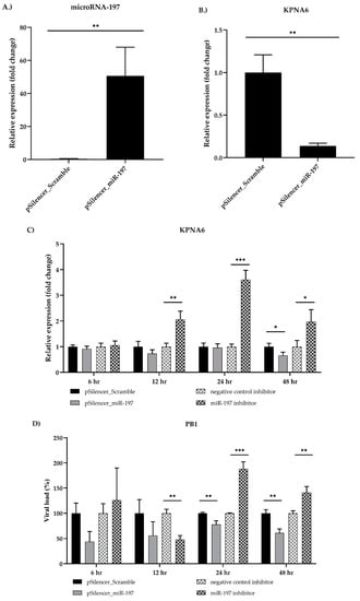 Furthermore, the effect of cfa-miR-197 overexpression on KPNA6 expression was determined. This investigation demonstrated that cfa-miR-197 were overexpressed when the cells were treated with pSilencer_miR-197 (Figure 4A; p = 0.0074). Concurrently, upregulated cfa-miR-197 reduced KPNA6 expression on mRNA level (Figure 4B; p = 0.0075). Additionally, the effect of cfa-miR-197 on viral replication was investigated. The cells were transfected with pSilencer-miR-197 and cfa-miR-197 inhibitor, followed by influenza B virus infection for multiple time points (Figure 4C,D). The results demonstrated that the cells treated with plasmid overexpressing cfa-miR-197 had significant down-expressions of KPNA6 at 48 hpi (p = 0.0323) and viral PB1 at 24 and 48 hpi (p = 0.076 and p = 0.034, respectively). In contrast, the cells treated with cfa-miR-197 inhibitor demonstrated significantly higher expression of KPNA6 at 24 and 48 hpi (p = 0.003 and p = 0.0347, respectively) and PB1 at 24 and 48 hpi (p = 0.0004 and p = 0.005, respectively). Taken together, these results indicated that KPNA6 might be directly regulated by cfa-miR-197, affecting influenza B virus replication.