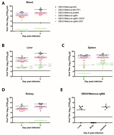Viremia and viral replication in tissues of mice that were infected with mouse-adapted EBOV. Groups of mice (n = 6) were infected intraperitoneally with 10 PFU of either EBOV/Mayinga-MA, EBOV/Makona-MA-PP1, EBOV/Makona-preMA, EBOV/Makona-rgMA, or the two single mutant viruses EBOV/Makona-rgMA-10979 or EBOV/Makona-rgMA-2357. (A) Blood, (B) liver, (C) spleen, and (D) kidney samples were collected on days 3 and 5 post-infection. (E) Viral dissemination to the lung, brain, and intestine was also examined for EBOV/Makona-rgMA infected mice on day 5 post-infection. Mean viral titers are shown, 2-way ANOVA with Bonferroni post-tests was performed, *** p-value < 0.001. The dashed line denotes the limit of detection of the TCID50/mL or TCID50/g assay.
