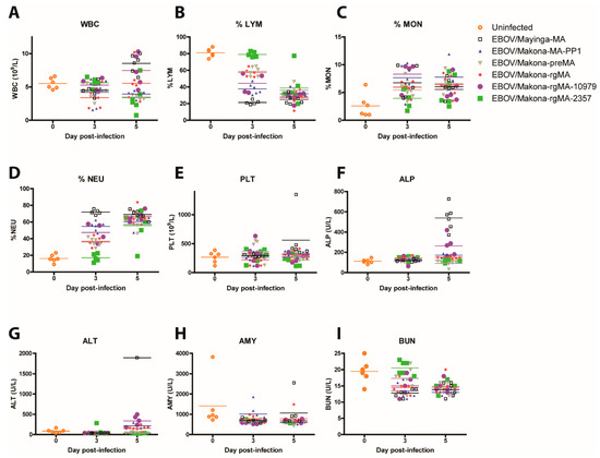 Hematology and blood biochemistry in mice who were infected with MA-EBOV. Groups of mice (n = 6) were infected intraperitoneally with 10 PFU of either EBOV/Mayinga-MA, EBOV/Makona-MA-PP1, EBOV/Makona-preMA, EBOV/Makona-rgMA, or the two single mutant viruses EBOV/Makona-rgMA-10979 or EBOV/Makona-rgMA-2357. Blood samples were collected on days 3 and 5 post-infection and (A) total white blood cell count (WBC), (B) % lymphocytes (%LYM), (C) % monocytes (%MON), (D) % neutrophils (%NEU), (E) platelets (PLT), (F) alkaline phosphatase (ALP), (G) alanine aminotransferase (ALT), (H) amylase (AMY), and (I) blood urea nitrogen (BUN) were measured. Blood was also collected on day 0 from a group of uninfected BALB/c mice (n = 6) to establish baseline levels for all the parameters.