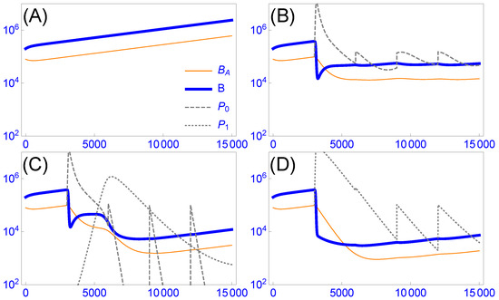 Phage dynamics and evolution as a property of phage decay rate. The vertical axis gives density, the horizontal axis time (minutes). Thin orange curves are protected bacteria in refuges, thick blue curves are susceptible, planktonic bacteria. Dashed grey indicates the fast-decaying phage (, decay rate of 0.008 per min), dotted grey indicates the better, slow-decaying phage (, decay rate of 0.002 per min). The inset key (A) applies to all panels. All trials use the same bacterial growth parameters and initial bacterial densities (given in Appendix A.1). When phage are present, they are first added at 3000 min and added every 3000 min thereafter. (A) Bacterial densities slowly increase in the absence of phages. (B) Treatment with rapidly-decaying phages causes a sudden decline in free bacterial densities, a somewhat slower decline in aggregate bacteria. The system is approaching equilibrium in that phage and bacterial densities are being approximately maintained between inoculations. (C) The phage inoculum consists of rapidly-decaying phage and 0.1 slowly-decaying phage, the latter value to represent mutation. The slowly-decaying phage ascends profoundly but then drops when bacterial densities are too low to sustain it. (D) The phage inoculum consists of just slowly-decaying phage. There is a substantial difference between the treatments with a pure fast-decaying phage or a pure slow-decaying phage. The main effect of starting with a slow-decay phage (D) instead of relying on within-host evolution (C) lies in the early dynamics, although a modest lingering benefit is apparent. Parameter values and initial conditions are given in Appendix A.1. Outcomes vary with parameter values, and the actual effect of within-host evolution or treatment with pre-evolved, slowly decaying phages would need to be evaluated for each specific application.