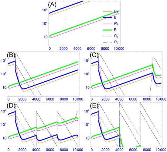 A ‘broad’ host-range phage that blocks bacterial resistance is subject to delayed ascendency. Periodic dosing may be only moderately more useful in suppressing bacterial resistance than is relying on intrinsic dynamics. The model assumes two strains of bacteria, each in two states (solid colored curves) and two strains of phage (dashed and dotted gray); the inset legend in (A) applies throughout, with equations and parameters given in Appendix A.2. The vertical axis gives density, the horizontal axis time (minutes). The phages differ in whether they can infect both bacteria (the ‘broad’ phage, given by , dotted curves) or just one bacterium (the ‘narrow’ phage, given by , dashed curves); the narrow phage has the advantage of a slightly higher adsorption rate. The bacterial strain given by blue and orange curves is sensitive to both phages, the other (green and pink curves) is resistant to the narrow phage and is initially rare. Each bacterium exists both planktonically (thick curves) and in aggregates (thin curves), with aggregates being protected from all phages. The two bacteria differ only in sensitivity to the phages. (A): Growth of the bacteria in the absence of phages. (B): Both phages are introduced at time t = 1000 at a density of but are considered to be extinct when densities drop below 0.1. They have a rapid effect of driving the sensitive bacterial strain to low numbers, allowing the resistant bacterium to become the majority. Both phages are lost when the bacterial density is too low to sustain them, and all bacteria begin to recover, maintaining their relative abundances. (C): The same as in (B), except that phages are never considered to be extinct. The broad phage eventually rebounds in response to the high numbers of ‘resistant’ bacteria, and it suppresses both strains. (D): A cocktail of both phages is applied, each at a dose of (time 1000) and then each at a dose of (times 4000 and 7000). The narrow-host range phage gains early because of its superior adsorption rate. Resistant bacteria eventually ascend and allow the broad phage to maintain itself. Note that there is a substantial lag before the broad phage dominates. (E) The same as in (D), but the inocula at times 4000 and 7000 are increased to of the broad phage. All bacteria are now pushed to near extinction.