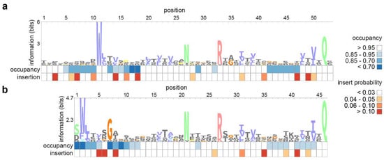 - Wheeler, T.J.; Clements, J.; Finn, R.D. Skylign: A tool for creating informative, interactive logos representing sequence alignments and profile hidden Markov models. BMC Bioinform. 2014, 15, 7. [Google Scholar] [CrossRef]