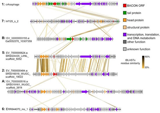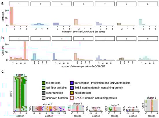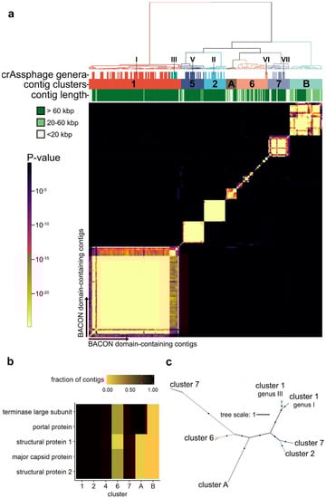 To investigate the biodiversity of the organisms containing crAss-BACONs, we quantified the similarity of these contigs through their shared protein family content [,,]. Hierarchical clustering of significantly shared protein family content per contig pair resulted in seven distinct clusters (Figure 2a). Five clusters contained contigs that were previously proposed as candidate crAss-like phage genera []. Cluster 1 represents the Alphacrassvirinae candidate subfamily and contains contigs from candidate genera I and III. Clusters 2, 5 and 7 conform with candidate genera II, V and VII, respectively. As previously observed for candidate genus VI [], cluster 6 is highly diverse (see also Figure S1, Supplementary Materials). The remaining two clusters, which we labelled A and B, contain contigs that were not previously identified as crAss-like phages.