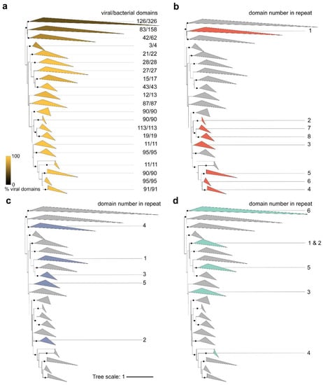 To investigate BACON domain evolution in phages and bacteria, we created a phylogeny of 1509 BACON domains (Figure 5a). This included all 1205 crAss-BACON domains found here and the 304 bacterial BACON domains from which PF13004 was made. Figure 5b–d depicts the crAss-BACON phylogenetic tree with colours indicating clades that contain domains from the crAss-BACON tandem repeats found in clusters 1, 5 and B, respectively. In cluster 1, domains that occupy a specific position in the crAss-BACON tandem repeat (e.g., first domain from the N-terminus, referred to with numbers in Figure 5b–d) each formed a distinct clade (Figure 5b). As domains that occupy a specific position in the cluster 1 crAss-BACON tandem repeat form distinct clades, with no overlap between them, the domain order of the arrays is conserved. This illustrates the evolutionary stability of the cluster 1 crAss-BACON tandem repeat. The clade that contains the first domain in the cluster 1 array (counted from the N-terminus) also contained a number of bacterial domains, whereas no bacterial domains are found in the clades of the seven other domains (Figure 5a). This reveals that this crAss-BACON tandem array resulted from domain duplications within the cluster 1 phage lineage. As the first domain is more closely related to bacterial domains than the other domains in the tandem array, it may be the ancestral domain from which the array expanded. The tree contains two branches that contain cluster 1 crAss-BACON domains that occupy positions 1, 7 and 8 in the array, and those at positions 3, 4, 5 and 6. This means that, similar to domain tandem repeat expansions in cellular organisms [], cluster 1 crAss-BACON expansion occurred by internal duplications, rather than exclusively at the N- and C-termini (Figure 5b). However, unlike cellular organisms [], cluster 1 crAss-BACON expansion involved several single domain duplications instead of simultaneous duplication of multiple domains (Figure S3, Supplementary Materials).