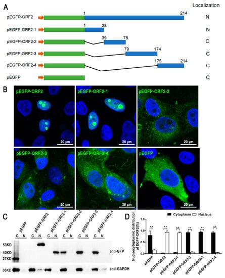 The localization of nuclear localization signals (NLSs) in ORF2. (A) Recombinant plasmids containing ORF2 or truncated ORF2 fragments with EGFP in the N-terminus were constructed. The subcellular localization of fusion proteins is indicated by N (nuclear) or C (cytoplasmic). (B) The localization of fusion proteins in transfected cells was observed by confocal microscopy. Scale bars = 20 μm. (C) and (D) Transfected cells were subjected to nuclear and cytoplasmic extraction. The abundance of expressed proteins in the nuclear and cytoplasmic extracts were detected by western blot. Nuclear/cytoplasmic distribution of the expressed proteins was further analyzed through densitometric quantification using Image-Pro software, data from three independent experiments are shown on the graph as the average ± standard error. One-way ANOVA; ** p < 0.01.
