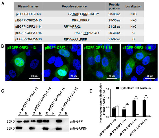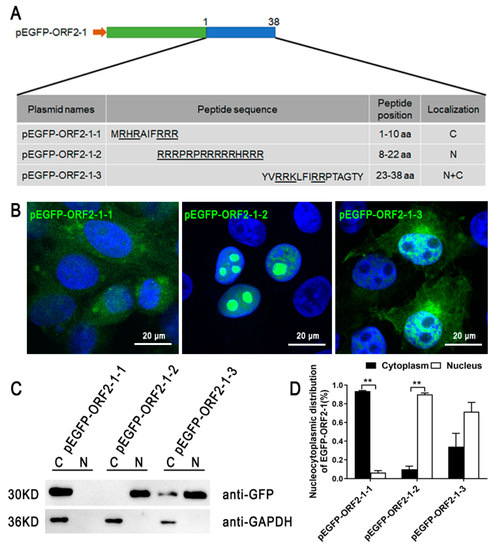 The NLS motifs in ORF2-1. (A) pEGFP-ORF2-1-1 (1–10 aa), pEGFP-ORF2-1-2 (8–22 aa), pEGFP-ORF2-1-3 (23–38 aa) were constructed and predicted NLSs were listed. (B) PK-15 cells were transfected with recombinant plasmids and observed by confocal microscopy after 24 h. Scale bars = 20 μm. (C) and (D) The nucleus and cytoplasm were extracted from the transfected PK-15 cells, and the abundance of expressed proteins in the extracts were detected by western blot after nuclear and cytoplasmic extraction, nuclear/cytoplasmic distribution of the expressed proteins was analyzed through densitometric quantification using Image-Pro software, data from three independent experiments are shown on the graph as the average ± standard error. One-way ANOVA; ** p < 0.01.