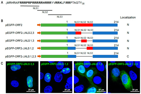 The map of NLSs in ORF2. (A) The main motifs of the NLSs in the N-terminal ORF2 (1–38 aa) are bold and the three NLSs are listed. (B) A sketch of the ORF2 indicating putative NLSs motifs by red boxes is shown, and the mutated fragments of the ORF2 are shown. (C) PK-15 cells were transfected with plasmids carrying mutated ORF2 gene (pEGFP-ORF2-∆NLS 2,3, pEGFP-ORF2-∆NLS 1,2, pEGFP-ORF2-∆NLS 1,3, and pEGFP-ORF2-∆NLS 1,2,3) to analyze their subcellular location. Subcellular localization of green fusion proteins was analyzed by confocal microscopy. Scale bars = 20 μm.
