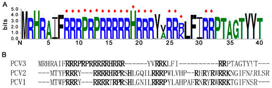 The variability of PCV3-ORF2 NLSs. (A) Logo of the N-terminal of all PCV3 ORF2 proteins (1–40 aa) reported and their complementary sequences, the nuclear localization signal peptide is showed by red ◊. (B) The NLSs sequence alignment between PCV3 ORF2 and other PCVs is showed and the key amino acids are bold.