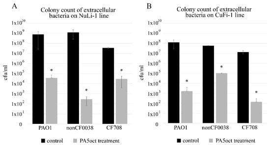 Phage PA5oct treatment of P. aeruginosa infecting NuLi-1 (A) and CuFi-1 epithelial cells (B). Colony count of bacteria collected from apical wash. The gray bars represent bacteria titers after 1.5 h of incubation with PA5oct phage. The black bars represent controls without phage treatment. The error bars indicate the standard deviation. The results are presented as the means ± SD. Statistical analysis was made using the ANOVA test (denoted p-values < 0.05). (*) the instance with p-values < 0.05.