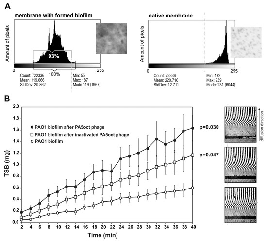 The direct effect of PA5oct phage on the mature (72 h) biofilm P. aeruginosa PAO1 (overspread on hydrophilic Nephrophane membrane scaffolding) was investigated using laser interferometry, a standardized approach used for diffusion properties measurement, which allows better comparison to other experiments on how the biofilm biomass is degraded [20,23]. First, the membrane was examined in terms of the biofilm coverage. Photos of membranes stained with crystal violet (CV) were collected and converted into grey-scale digital images (1 denotes black and 256 denotes white) (Figure 2A). Using the ImageJ computer imaging software [36] the degree of membrane coverage by biofilm was estimated at around 93%. Second, the biofilm was treated with active or inactive phages for 4 hours and then washed out to remove phage suspensions. Next, the diffusion event was measured by interferometry for 40 min in real-time (Figure 2B). An increase of TSB diffusion rate through the biofilm layer correlates with the structural degradation of the biofilm/matrix. The diffusion rate of medium transported through the intact biofilm-covered membrane after 40 min (0.605 mg) was significantly lower than for biofilm (p < 0.05) after active and inactivated phage treatment, reaching 1.64 mg and 1.17 mg, respectively. These experiments indicated that phage PA5oct as infecting virions as well as inactivated virions was able to reduce the density of Pseudomonas biofilm after 4 h-treatment. The increase in diffusion obtained after the application of inactivated particles may be explained by an enzymatic activity of virion-associated proteins responsible for biofilm matrix degradation.