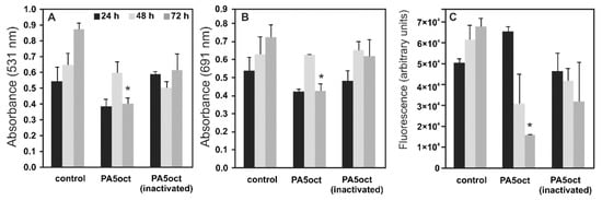 The anti-biofilm effect of PA5oct phage treatment (4 h) on 24, 48 and 72 h PAO1 biofilm formed on Nephrophane membrane. The biomass evaluation by CV staining (A); the level of pyocyanin in growth medium (B); the fluorescence of pyoverdin in growth medium (C). Untreated biofilm was used as control. The results are presented as the means ± SD. Statistical analysis was made by the ANOVA test (denoted p-values < 0.05). (*) the instance with p-values < 0.05.