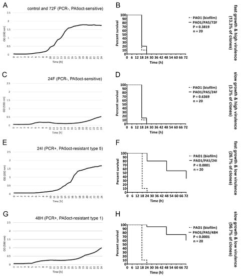 Phenotypic patterns in PAO1 clones treated with PA5oct. Growth curves (A,C,E,G) of selected bacterial clones combined with a survival of infected G. mellonella (B,D,F,H) for PA5oct-sensitive and PA5oct-resistant clones. Fast-growing with a high virulence (control and 72F; (A)/(B)); slow-growing with a high virulence (24F; (C)/(D)); fast-growing with a low virulence (24I; (E)/(F)), and slow-growing with a low virulence (48H; (G)/(H)). Data for all clones are presented in Supplementary Figure S2.