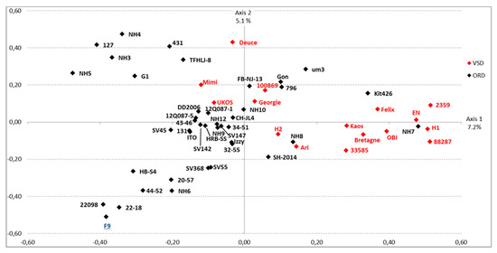 MCA graph. The graph presents the sequences sorted after MCA analysis on the basis of the residue properties of region E domain. The horizontal axis is able to differentiate ORD strains (black) and VSD strains (red). The vaccine strain F9 (attenuated ORD strain) is shown in blue.