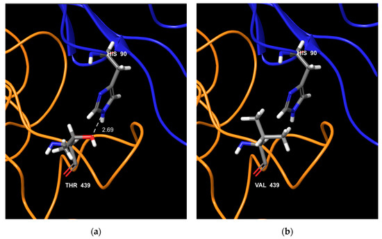 Interaction between Feline calicivirus (FCV) VP1 and Jam-1 receptor for ORD and VSD strains. FCV VP1 (orange chain) aa 438 (labelled 439 in the figure as a one amino acid shift is present in the 6GSI sequence compared to other strains used in this article) and Jam-1 receptor (blue chain) for ORD FCV typical strains (a) and VSD typical strain (b). For the ORD strain, both aa have redox properties and could create an electric bond. For the VSD strain, as the aa 438 does not have redox properties, no bond could be created. Amino acid color code: grey bar for carbon; blue bar for nitrogen; red bar for oxygen; white bar for hydrogen.
