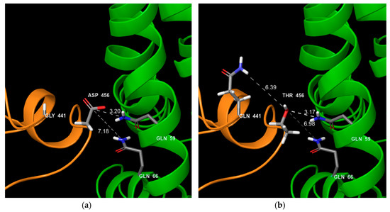 VP1 interactions with VP2 ORD FCV typical strain and VSD typical strain. Orange chain: VP1; green chain: VP2; (a) ORD strain; (b) VSD strain. For ORD strains, aa440 (441 in the 6GHI sequence) is generally a glycine and for VSD a glutamic acid or a glutamine. The aa455 (456 in the 6GHI sequence) is generally an aspartic acid for ORD strains and generally a threonine for VSD. For the ORD strain, no interaction is shown between VP1 gly440 and thr456. In contrast, for VSD, an interaction could occur between gln441 and thr455 and may subsequently consolidate the interaction between VP1 and VP2.
