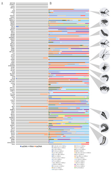 As described previously [1], invertebrate species were sampled from various terrestrial and freshwater locations (Anhui, Beijing, Hubei, Xinjiang, Zhejiang provinces) and marine and coastal (East and South China sea) environments in China. This resulted in the generation of 87 sequencing libraries of invertebrate samples covering a wide diversity of phyla, including Arthropoda (the majority), Nematoda, Platyhelminthes, Mollusca, Sipuncula, Annelida, Chordata, Echinodermata, and Cnidaria. In addition, a further five sequencing libraries were generated as part of this study, sourced from Arthropoda, Maxillopoda, Oliochaeta, Turritella and Plasmodium berghei (Supplementary Table S1). The processed samples were organized into either simple (single/multiple samples from one or two closely related species) or complex (multiple species from a taxonomic group) libraries that we then mined for DNA viruses. Total RNA was extracted from the samples, and ribosomal RNA (rRNA) was depleted during the library preparation step. Each library underwent paired-end (90 or 100 bp) sequencing on a HiSeq2000 platform (Illumina, San Diego, USA). A more detailed description of the collection, storage, processing, construction, and sequencing of the libraries can be found elsewhere [1].