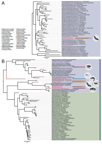 Phylogenetic relationships of the ssDNA virus families Genomoviridae and Parvoviridae, including the novel viruses identified in this study. The abundance of family-specifc contigs are represented by horizontal bars next to the associated virus. This representation of viral contig abundance is limited to the DNA virus families for clarity. (A) Phylogenetic relationships of gemykibiviruses, including three novel species discovered here: Myriapoda gemykibivirus 1, Myriapoda gemykibivirus 2 and Myriapoda gemykibivirus 3 (highlighted in red). All three viruses were sampled in millipedes (Arthropoda, myriapoda) from Beihai, China (WGML library). For clarity, the tree was mid-point rooted. The abundance of gemy-like contigs (blue portion) is shown beside the novel sequences. Bootstrap values greater than 85% are shown next to nodes, represented by an asterisk. All horizontal branch lengths are scaled according to the number of amino acid substitutions per site. (B) Phylogenetic relationships of the Parvoviridae, including the seven densoviruses identified in this study: Perisesarma bidens densovirus, Arthropod densovirus, Myriapoda densovirus 1, Mydriapoda densovirus 2, Decapod penstyldensovirus 1 variant Zhejiang, Tetragnatha maxillosa densovirus, and Periplaneta fuliginosa densovirus variant Hubei (highlighted in red). Several densovirus-like sequences that have been previously associated with reagent contaminantion were also included and highlighted in purple. The tree was mid-point rooted to distinguish the Densovirinae and the Parvovirinae (blue and green boxes, respectively). The abundance of parvo-like contigs (represented by the red portion) in the respective libraries is shown beside the two novel sequences. Bootstrap values greater than 85% are shown next to the relevant nodes, represented by an asterisk. All horizontal branch lengths are scaled according to the number of amino acid substitutions per site.