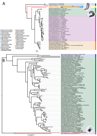 Phylogenetic relationships of the dsDNA virus families Polyomaviridae and Herpesviridae, including the novel species identified in this study. The abundance of family-specifc contigs are represented by horizontal bars next to the associated virus. This representation of viral contig abundance is limited to the DNA virus families for clarity. (A) Phylogenetic relationships among known herpesviruses and the two novel sequences, Peanut worm herpesvirus (BHNXC library) and Sandworm herpesvirus (BHSC library) identified here and highlighted in red. The mollusc-infecting Malacoherpesviruses are shown in the blue box. Alpha-, beta- and gamma-herpesviruses are shown in the green, pink, and orange boxes, respectively. The two novel herpesvirus sequences identified here are shown in yellow. The abundance of herpes-like contigs (represented by the light blue portion) is shown beside the two novel sequences. Bootstrap values greater than 85% are shown next to appropriate nodes, marked by asterisks. All horizontal branch lengths are scaled according to the number of amino acid substitutions per site. For clarity, the tree is mid-point rooted. (B) Phylogenetic relationships among 88 polyomaviruses including the novel Spider polyomavirus (highlighted in red). The novel Spider polyomavirus falls in a distinct clade (pink box) that includes the single other invertebrate-infecting polyomavirus, Baja California bark scorpion polyomavirus 1. This clade is distinct from the fish-infecting polyomaviruses (blue) and terrestrial polyomaviruses (green). Bootstrap values greater than 85% are shown next to their appropriate nodes, marked by an asterisk. As polyoma-like virus reads were at low abundance in all libraries their abundance is not shown here. All horizontal branch lengths are scaled according to the number of amino acid substitutions per site. For clarity, the tree was mid-point rooted.