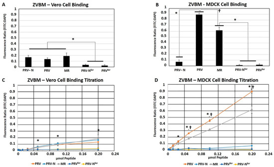 Zika virus binding motif (ZVBM) binding and Zika virus (ZIKV) inhibition in Vero cells. Peptides PRV, PRV-N, and MR bound Vero cells significantly (* p < 0.05) above scrambled PRVScr and PRV-NScr controls (A). Peptides PRV and MR bound Madin–Darby canine kidney (MDCK) cells significantly (* p < 0.05) above PRV-N and scrambled PRVScr and PRV-NScr controls, and PRV bound with significantly († p < 0.05) higher avidity than MR (B). Two-fold dilutions of ZVBM peptides resulted in proportional reductions in signal, with significant (*, p < 0.05) differences between binding peptides and scrambled controls apparent with 0.05 μmol for Vero cells (C) and 0.0125 μmol for MDCK cells (D). The difference in avidity between PRV and MR became significant († p < 0.05) with 0.0125 μmol of treatment. Error bars indicate standard deviations in all panels.