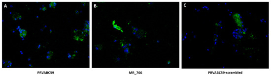 Peptide binding to dorsal root ganglia (DRG) neurons ex vivo (20x magnification). Primary DRG neurons from C57 black mice (DAPI, blue fluorescence) were exposed to ZVBM peptides (FITC, green fluorescence) from (A) PRVABC59, (B) MR_766, and (C) scrambled (unglycosylated) PRVABC59. Punctate green staining around the DRG nuclei was observed in panels A and B, but was largely absent from panel C.