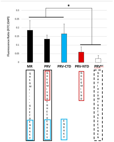 Peptides representing the NTD and the CTD of strain PRVABC59′s ZVBM sequence (“PRV-NTD” and “PRV-CTD”) were synthesized and N-terminally labelled with FITC (Figure 4). To avoid ambiguities with the impact of glycosylation, neither peptide was NAGylated, and Vero cells were used to assess binding. PRV-NTD was unable to bind Vero cells above the scrambled control PRVScr, whereas PRV-CTD bound significantly (p < 0.05) above PRVScr. Additionally, PRV-CTD bound at equivalent levels to full-length PRV and to MR.