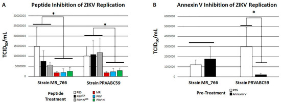 Host cell monolayers were pre-treated with PRV, PRV-N, MR, and scrambled controls PRVScr and PRV-NScr. To avoid ambiguities from the impact of glycosylation, Vero cells were used to for this analysis. All peptides were used to inhibit both strains MR_766 and PRVABC59. Pretreatment of Vero cell monolayers with PRV, PRV-N, and MR significantly (p < 0.01) inhibited infectivity and CPE generation by both ZIKV MR_766 and ZIKV PRVABC59 relative to scrambled control peptides and Vero cells pretreated with PBS alone (Figure 5A). MDCK cells are still permissive for ZIKV replication [48], suggesting that additional mechanisms facilitate infection when ZVBM is NAGylated. We pretreated ZIKV strains MR_766 and PRVABC59 with the PS-binding protein annexin V prior to infection of Vero cell monolayers. Annexin V significantly (p < 0.05) inhibited infectivity of PRVABC59 relative to untreated controls but did not inhibit MR_766 (Figure 5B).