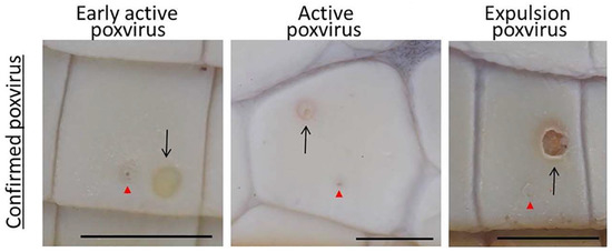 The belly skin of a juvenile saltwater crocodile showing poxvirus lesions as defined by Moore et al. [4]. Black arrows indicate the lesion tested. Red arrowheads are integumentary sensory organs (ISOs). Bar = 5 mm.