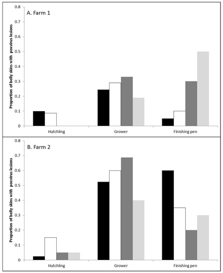 Proportion of belly skins with poxvirus lesions present on A. Farm 1 and B. Farm 2 across the three different age categories (hatchling, grower and finishing pen) and the four different sampling periods (Sampling 1 = solid black; Sampling 2 = white; Sampling 3 = dark grey; Sampling 4 = light grey).