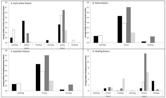 The average number of different stage poxvirus lesions in the different age categories and sampling periods (Sampling 1 = solid black; Sampling 2 = white; Sampling 3 = dark grey; Sampling 4 = light grey). Significant differences (p < 0.05) between farms were only observed in the number of A. early active lesions and D. healing lesions, thus only these graphs show the differences between farms.
