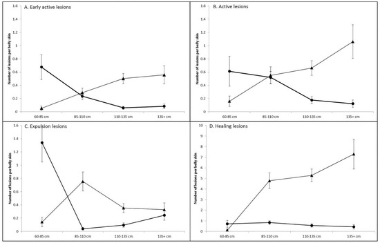 Model-adjusted means ± SE for the number of lesions per belly skin in either (A) Early active lesions; (B) Active lesions; (C) Expulsion lesions or (D) Healing lesions in the different crocodile total length size categories. Farm 1 is circles, and Farm 2 is triangles.