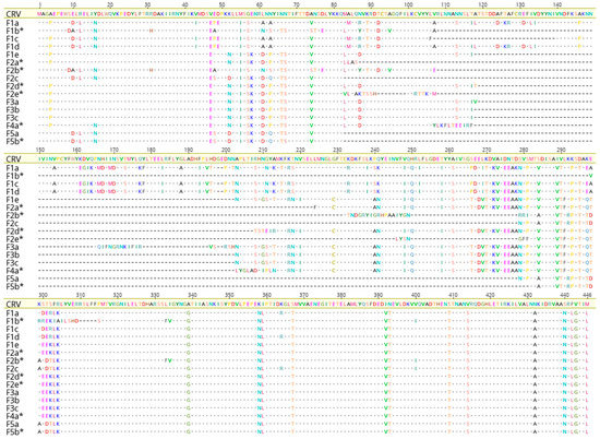 Pairwise comparison on protein sequences of IMV A type inclusion-like protein P4c under the genus Crocodylidpoxvirus, where IMV A type inclusion-like protein P4c of nile crocodilepox virus (CRV) was used as a reference. The fragment genes (asterisks) were aligned after concatenating the fragmented gene belonging to individual isolates. All other large gaps were related to multiple insertions/deletions.