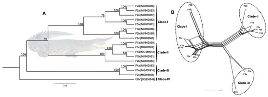 Maximum likelihood (ML) tree of crocodylidpoxviruses detected in saltwater crocodile and Nile crocodile from Australia and Zimbabwe, respectively (A). There was a total of 16 SwCRV genome sequences sourced from five different Australian farms (Table 4) and a Nile crocodilepox virus genome sequence sourced from Zimbabwe. The ML tree was constructed from a multiple-nucleotide alignment of ~137 kbp core region (large gaps removed) from the selected complete genome sequences of Crocodylidpoxvirus. The numbers on the left show bootstrap values as percentages (after 1000 replicates), and the labels at branch tips refer to original sample identification followed by GenBank accession number in parentheses. (B) NeighborNet tree presenting the relationship among SwCRV sequences. The network was computed using SplitsTree software. EqualAngle was employed for splits transformation. Clusters were highlighted by round dot circles.