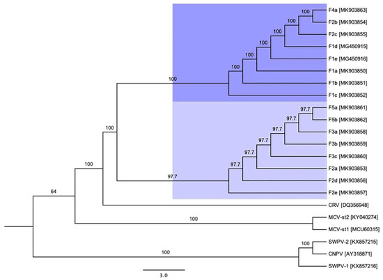 ML phylogenetic tree of the DNA polymerase gene constructed from the protein sequences of genus Crocodylidpoxvirus, with an addition of selected DNA polymerase gene of avipoxviruses and Molluscum contagiosum virus. The numbers on the left show bootstrap values as percentages, and SwCRV clades were highlighted using blue shading. The abbreviations for other poxviruses were used: CRV (Nile crocodilepox virus); MCV-st1 (Molluscum contagiosum virus subtype 1); MCV-st2 (Molluscum contagiosum virus subtype 2); CNPV (Canarypox virus); SWPV-1 (Shearwaterpox virus-1); SWPV-2 (Shearwaterpox virus-2).