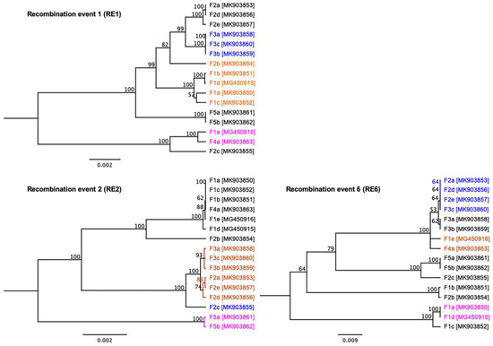 Maximum likelihood (ML) phylogenetic trees were constructed according to recombination events (RE1, RE2 and RE6). ML trees were colour coded as blue for the potential minor parent, magenta for the potential major parent and orange for the recombinant sequence. Branches were equipped with branch support values obtained from 1000 bootstrap replicates.