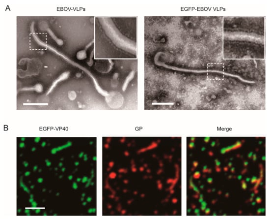 Characterization of Ebola virus-like particles (VLPs) labeled with EGFP. (A) TEM images of EGFP-Ebola virus (EBOV) VLPs. Scale bar: 200 nm. (B) Fluorescence imaging of the EGFP-labeled VLPs (green: EGFP) that were immunostained with anti-GP antibody (red: Alexa Fluor 555). Scale bar: 1 μm.