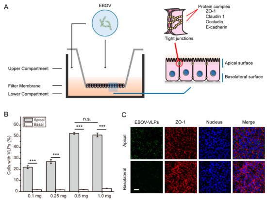 Ebola virus VLPs enter polarized Vero cells from the apical surface. (A) Experimental schematic of EBOV entry into polarized cells in the Transwell system. Cells were cultured on Transwell membranes (1.0 μm pore) until polarization was established. EGFP-labeled VLPs were added to either the apical or basolateral chamber and incubated at 37 °C for 1.5 h. Next, the cells were collected and analyzed for subsequent experiments. (B) EGFP-EBOV VLPs enter polarized Vero cells from apical surfaces. The percent of infected cells was measured by flow cytometry. (Histograms display averages ± SD; n = 3; *** p < 0.01; n.s. > 0.05). (C) Visualization of the EGFP-EBOV VLPs entering the apical or basolateral membrane. ZO-1: zonula occludens-1. Scale bar: 50 μm.