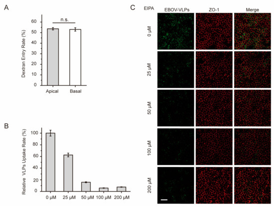 Next, polarized Vero cells were treated with EIPA, a small molecule inhibitor of macropinocytosis, to address the question of whether macropinocytosis is involved in the internalization of Ebola VLPs. As shown in Figure 3B and Figure S3D, EIPA inhibited the uptake of VLPs in polarized Vero cells in a dose-dependent manner. Fluorescence imaging demonstrated that the uptake rate of EBOV VLPs was reduced with increasing doses of EIPA (Figure 3C). These results showed that macropinocytosis was involved in the uptake of Ebola VLPs into polarized Vero cells.