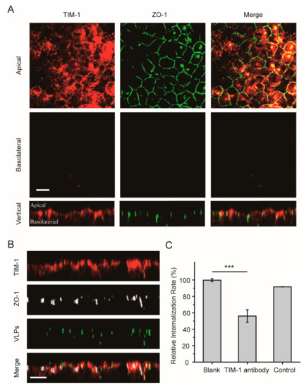 The cells were cultured on permeable filter support until polarization was established. The cells were washed three times and incubated with anti-TIM-1 or anti-Axl primary antibodies at 37 °C for 1 h. Normal mouse or rabbit IgG was used in the control group. After blocking, EBOV VLPs were added, and the cells were incubated for 1.5 h. The cells were washed and collected for subsequent experiments.