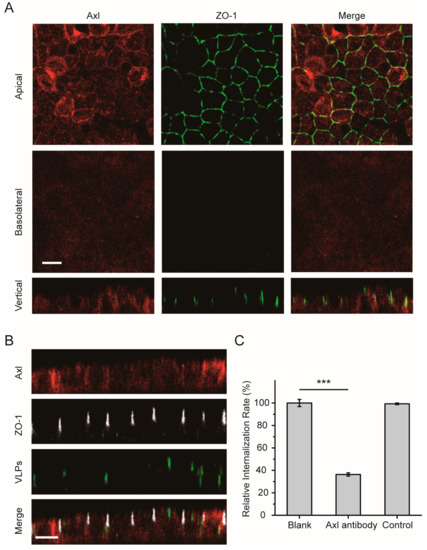 Apical distribution of the Axl receptor in polarized Vero cells. (A) Axl appeared to be preferentially apically distributed. Polarized Vero cells were fixed and incubated with anti-Axl antibody (red: Alexa Fluor 555). ZO-1 was stained with anti-ZO-1 antibody (green: Alexa Fluor 488). Scale bar: 10 μm. (B) Confocal images representing the distribution of the Axl receptor during EGFP-VLP internalization into polarized Vero cells. Scale bar: 10 μm. (C) EGFP-VLP uptake was inhibited by blocking the Axl receptor. Histograms display averages ± SD; n = 3; *** p < 0.01; n.s. > 0.05.