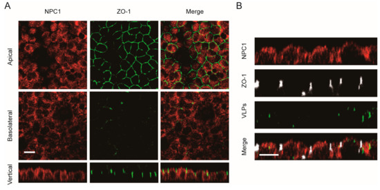 Nonpolarized distribution of the NPC1 receptor in polarized Vero cells. (A) NPC1 staining was detected in both apical and basolateral sections. Scale bar: 10 μm. (B) Confocal images representing the distribution of the NPC1 receptor during EGFP-VLP internalization into polarized Vero cells. Scale bar: 10 μm.