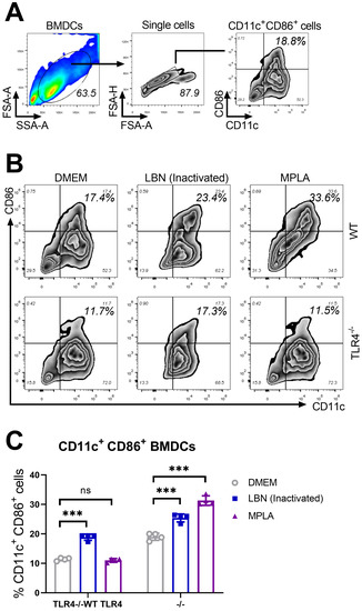 The gating strategy and representative flow cytometric plots of activated BMDCs are shown in Figure 1A. The representative CD11c+ CD86+ BMDCs from three groups are presented in Figure 1B. As shown in Figure 1C, in WT and TLR4−/− BMDCs, inactivated-LBNSE induced significantly more maturation of BMDCs (CD11c+ CD86+ cells) than DMEM. In WT BMDCs, MPLA induced significantly more maturation of BMDCs (CD11c+ CD86+ cells) than DMEM. However, in the TLR4−/− BMDCs, no significant difference in maturation of BMDCs was observed between MPLA and DMEM treatment. Together, these data suggest that MPLA promotes the maturation of BMDCs via a TLR4-dependent pathway.