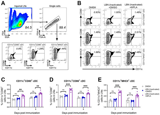 At 7 and 14 days post-immunization (d.p.i.), the inguinal LNs of these three groups were collected and stained for detecting CD11c (a cDCs marker), CD80, CD86, and MHCII. The gating strategy and representative flow cytometric plots of the activated cDCs including CD11c+ CD80+, CD11c+ CD86+, and CD11c+ MHCII+ cDCs are shown in Figure 2A. The representative plots of activated cDCs from these three groups are analyzed and presented in Figure 2B. As shown in Figure 2C–E, the statistical analysis of activation/maturation cDCs including CD11c+ CD80+ (Figure 2C), CD11c+ CD80+ (Figure 2D) and CD11c+ CD80+ cDCs (Figure 2E) indicated that the group immunized with BPL-inactivated LBNSE supplemented with MPLA exhibited a significantly higher proportion of mature cDCs than the group immunized merely with BPL-inactivated LBNSE.