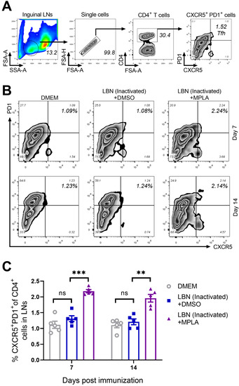 The costimulatory molecules CD80/CD86 expressed on antigen-presenting cells (APC), such as cDCs, enhanced the interaction between APC and T cells, and regulated the activation and recruitment of CD4+ T cells [15,37]. Therefore, The Tfh cells in the inguinal LNs of the group immunized with BPL-inactivated LBNSE supplemented with MPLA were investigated. The gating strategy and representative flow cytometric plots of Tfh cells (CD4+ CXCR5+ PD1+) are shown in Figure 3A,B, respectively. At 7 and 14 d.p.i., significantly more Tfh cells were detected in the group immunized with MPLA supplemented with BPL-inactivated LBNSE than the group immunized merely with BPL-inactivated LBNSE. However, at 7 and 14 d.p.i., no significant difference in the number of Tfh cells was observed between the group immunized with BPL-inactivated LBNSE alone and the group mock-immunized with DMEM (Figure 3C). These results indicated that the supplementation of MPLA as an adjuvant into BPL-inactivated LBNSE could facilitate the recruitment of Tfh cells in the inguinal LNs of mice.