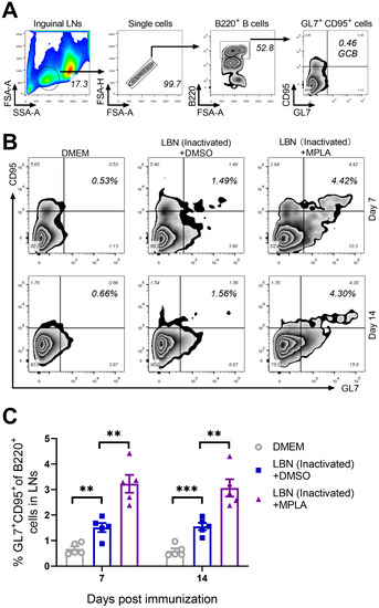 The quality and intensity of the GC responses are directly regulated by Tfh cells, thus providing growth and differentiation signals to GC B cells [38,39]. The effect of MPLA on the generation of GC B cells was evaluated in mice immunized with BPL-inactivated LBNSE with or without MPLA. The gating strategy and representative flow cytometric plots of GC B cells (B220+ GL7+ CD95+) are shown in Figure 4A,B, respectively. As expected, at 7 and 14 d.p.i., the group immunized with BPL-inactivated LBNSE supplemented with MPLA was found to generate significantly more GC B cells in the inguinal LNs than the group immunized merely with BPL-inactivated LBNSE, and the group immunized with BPL-inactivated LBNSE alone was found to generate significantly more GC B cells than the group mock-immunized with DMEM (Figure 4C). These data suggested that the MPLA as an adjuvant of inactivated rabies vaccines could promote the proliferation of GC B cells in RABV-immunized mice.