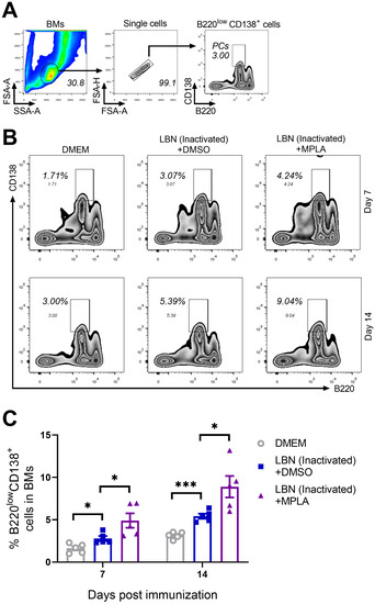 Three groups of C57BL/6 mice (n = 5/group) were inoculated with 100 μL DMEM, or inactivated LBNSE, or the mixture of inactivated LBNSE and MPLA via IM incubation. At 7 and 14 d.p.i., all of the mice in the three groups were euthanized, and their BM cells were collected from femurs and tibias for the detection of PCs. Single-cell suspensions of the PCs were filtered through a 40-μm strainer, and single cells were stained with antibodies representing markers of PCs. (A) Representative gating strategy for the detection of PC cells. (B) Representative flow cytometric plots of B220low CD138+ PCs from three groups. (C) Statistical results of B220low CD138+ PCs. Data are presented as means ± SEM. Asterisks indicate a significant difference between the groups at the levels of * p < 0.05 and *** p < 0.001.