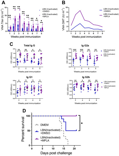 Three groups of C57BL/6 mice (n = 5 /group) were inoculated with 100 μL DMEM, or inactivated LBNSE, or a mixture of inactivated LBNSE and MPLA via IM incubation. The serum of the mice was harvested every week until the eighth-week post-immunization (p.i.). (A) Sera of mice (1 to 8 weeks) were tested for VNA against RABV. (B) The geometric mean of VNA was analyzed and presented. (C) RABV-specific total-IgG, IgG1, IgG2a and IgG2b in the sera of mice (week 2, 4, 6 and 8) were tested by indirect ELISA. (D) At 8 weeks p.i., all of the mice in the three groups (n = 10/group) were challenged via IM incubation with 100 × LD50 of DRV-Mexico, and the mortality ratio was then monitored for 21 days. Data are presented as means ± SEM. Asterisks indicate significant difference between the groups at the levels of * p < 0.05, ** p < 0.01, and *** p < 0.001 with “ns” standing for “not significant”.
