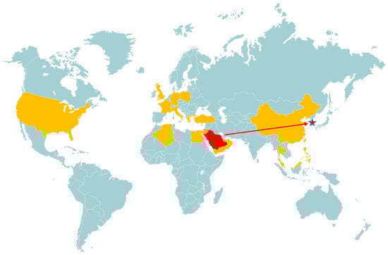 Global distribution of MERS-CoV outbreaks from 2012–2019. Data includes all documented occurrences of disease, including imported, nosocomial, and community cases. Highlighted in orange are countries with past or present MERS-CoV cases, while the countries of interest for the purposes of this paper, Saudi Arabia and South Korea, are shown in red. The direct importation of MERS-CoV from Saudi Arabia to South Korea is shown in red, stimulating the 2015 outbreak. Global maps were derived and/or modified from Servier Medical Art under a Creative Commons Attribution 3.0 Unported License.