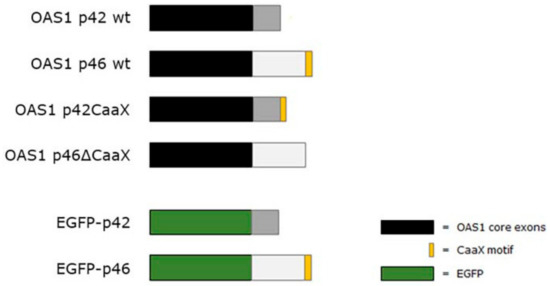 Oligoadenylate synthetase (OAS)1 and EGFP constructs used for transient transfections. The diagram shows the different types of OAS1 and EGFP constructs used to induce overexpression of the translated proteins for the high resolution respirometry (HRR) and localization experiments. All the OAS1 types consist of 5 core exons (black). The wild type p42 (grey) and p46 (white) isoforms are different in their C-terminal ends and are modified to include or exclude the CaaX motif (yellow). Full-length EGFP (green) is fused to either the C-terminal of p42 or p46 as indicated.