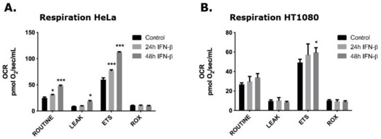 We first analyzed the effect of IFN-β response on cellular respiration of the human HeLa and HT1080 cell lines using high resolution respirometry (HRR). Very little literature describes the effect of type I IFN on respiration in general and the direct effect on these cell lines have to our knowledge not been established. However, type I IFN is thought to promote glycolysis and decrease oxidative consumption [29]. Therefore, it was interesting to see that the oxygen consumption rate (OCR) in HeLa cells was increased by approximately two-fold after 48 hours of IFN-β treatment in three different respiration states, i.e., ROUTINE, LEAK, and ETS (Figure 2A). The ROUTINE state is the basal respiration in normal media, while the LEAK state is induced by the ATP-synthase inhibitor oligomycin signifying the non-phosphorylating resting state and the degree of proton leak across the inner mitochondrial membrane. ETS state is the maximal OCR obtained when membrane potential is dissipated by the uncoupler CCCP (Carbonyl Cyanide m-ChloroPhenylhydrazone). This results in a noncoupled mitochondrial state in which there are no limitations to proton availability thereby enabling the determination of the maximum capacity of the electron transport system (ETS). The residual oxygen consumption (ROX) state is induced by the Complex III inhibitor, antimycin A, and is based on oxygen consuming enzymes and ROS production. A representative of an HRR measurement of HeLa cells can be seen in Supplementary Figure S1. The OCR of HT1080 cells was also significantly increased after 48 hours of IFN-β treatment in the ETS respiration state (Figure 2B), albeit much less than in HeLa cells. The OCR values in the different respiration states of HeLa and HT1080 cells are very similar in the untreated controls, however when responding to IFN-β the two cell lines show significantly different behaviors.