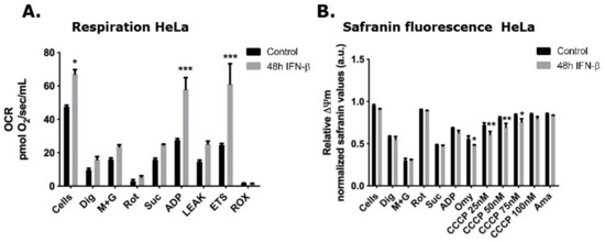 Respiration and mitochondrial membrane potential in IFN-β treated HeLa cells. Cells were treated with 1000 U/mL IFN-β for 48 h or left untreated. Simultaneous oxygen consumption rates (A) and levels of fluorescent safranin (B) were measured according to the extended SUIT protocol for High Resolution Respirometry. Data are presented as mean values of two independent experiments and error bars represent SEM. Safranin values are normalized against highest initial fluorescence before cell addition and are in arbitrary units (a.u.). Note that a lower safranin value equals a higher Δψm.* indicates P < 0.05, ** indicates P < 0.001, and *** indicates P < 0.0001 compared with control cells.